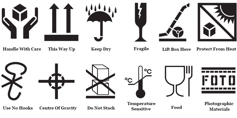 If your goods are fragile, the shipping packages should be marked with the signs for “handle with care” and “this way up”. Such shipping mark labels clearly tell the people handling your packages the right processing methods against damage.